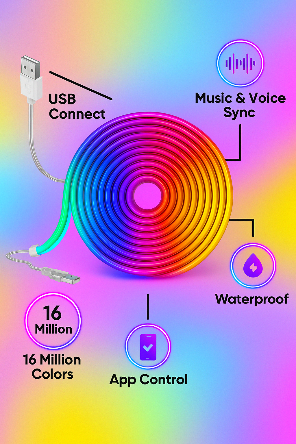Bend it, loop it, or wrap it—this neon strip is ultra-flexible, making it perfect for custom installations on walls, desks, or furniture.